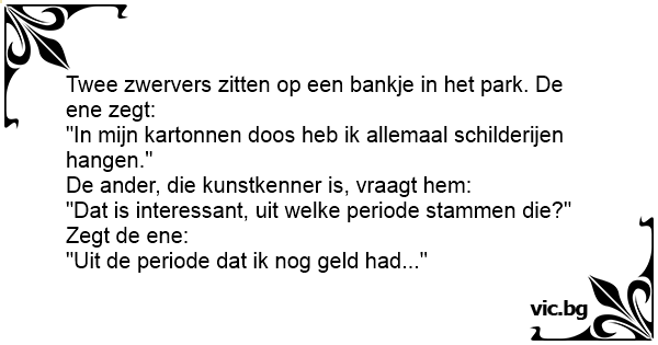 Twee zwervers zitten op een bankje in het park. De ene zegt: