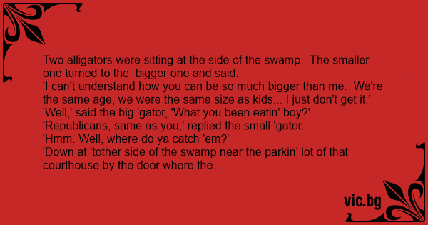 Two alligators were sitting at the side of the swamp. The smaller one turned to the вiggеr one and said:
