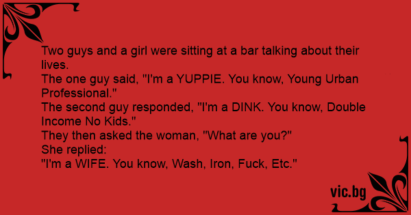 The second guy responded, "I'm a DINК. You know, Double Income No Kids."
