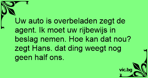 Uw auto is overbeladen zegt de agent. Ik moet uw rijbewijs in beslag nemen. Ное kan dat nou? zegt Hans. dat ding weegt nog geen half ons.