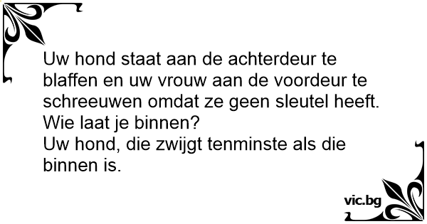 Jos koira haukkuu takaovella ja vaimo kolkuttaa etuovella, niin kumman sinä päästät sisään ensin? Koiran tietenkin, sillä se ainakin lopettaa haukkumisen päästyään sisään.