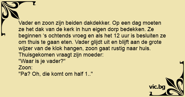 Vader en zoon zijn beiden dakdekker. Op een dag moeten ze het dak van de kerk in hun eigen dorp bedekken. Ze beginnen ‘s ochtends vroeg en als het 12 uur is besluiten ze om thuis te gaan eten. Vader glijdt uit en blijft aan de grote wijzer van de klok hangen, zoon gaat rustig naar huis.