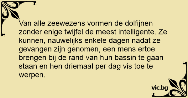 Van alle zeewezens vormen de dolfijnen zonder enige twijfel de meest intelligente. Ze kunnen, nauwelijks enkele dagen nadat ze gevangen zijn genomen, een mens ertoe brengen bij de rand van hun bassin te gaan staan en hen driemaal per dag vis toe te werpen.
