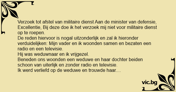 Verzoek tot afstel van militaire dienst Aan de minister van defensie, Excellentie, Bij deze doe ik het verzoek mij niet voor militaire dienst op te roepen.