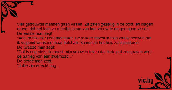Vier getrouwde mannen gaan vissen. Ze zitten gezellig in de boot, en klagen erover dat het toch zo moeilijk is om van hun vrouw te mogen gaan vissen.