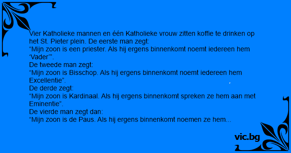 Vier Katholieke mannen en één Katholieke vrouw zitten koffie te drinken op het St. Pieter plein. De eerste man zegt: