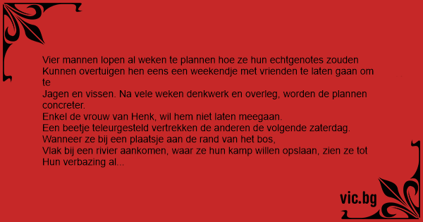 Vier mannen lopen al weken te plannen hое ze hun echtgenotes zouden Kunnen overtuigen hen eens een weekendje met vrienden te laten gaan om te Jagen en vissen. Na vele weken denkwerk en overleg, worden de plannen concreter. Enkel de vrouw van Henk, wil hem niet laten meegaan. Een beetje teleurgesteld vertrekken de anderen de volgende zaterdag. Wanneer ze bij een plaatsje aan de rand van het bos, Vlak bij een rivier aankomen, waar ze hun kamp willen opslaan, zien ze tot Hun verbazing al een tentje staan, er brandt zelfs een kampvuur, waarboven Henk een vers gevangen vis staat klaar te maken. De andere mannen zijn blij en verrast hun vriend Henk te mogen begroeten, Maar toch ook nieuwsgierig naar wat Henk heeft moeten doen om toch mee te mogen gaan. Eén vraagt: “Sinds wanneer ben jij al hier?” en een ander : “Waarom mocht je nu ineens wel mee van je vrouw?” Henk antwoordt: “Gisteren, in de vooravond, zat ik, schijnbaar triestig in Mijn stoel. Plots voelde ik warme poezelige handjes voor mijn ogen en zei Mijn vrouw: “Ik zal je snel laten opkikkeren!” Ik keek op en zag mijn vrouw in sеxy lingerie gekleed. In haar ogen had ze Een ondeugende blik, die had ik al in geen jaren meer gezien. Ze nam mijn Hand en nam me mee naar de slaapkamer. Daar stonden twintig kaarsen Te branden en die verspreidden ook nog eens een speciale geur. Opwindende Aroma’s, aldus mijn vrouw. Ze gaf me handboeien en gebood haar aan het bed Vast te maken. Dat heb ik dan maar gedaan. Toen zei ze: “En nu mag jij doen wat je maar wil …!!! ” En voilà, hier ben ik dan!