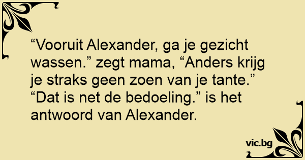 “Vooruit Alexander, ga je gezicht wassen.” zegt mama, “Anders krijg je straks geen zoen van je tante.”