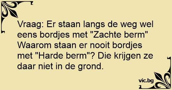 Vraag: Er staan langs de weg wel eens bordjes met "Zachte berm" Waarom staan er nooit bordjes met "Harde berm"? Die krijgen ze daar niet in de grond.