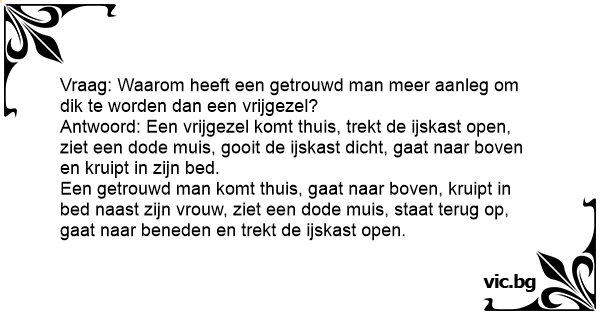 Antwoord: Een vrijgezel komt thuis, trekt de ijskast open, ziet een dode muis, gooit de ijskast dicht, gaat naar boven en kruipt in zijn bed.