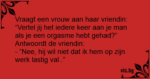 Vraagt een vrouw aan haar vriendin:<br />“Vertel jij het iedere keer aan je man als je een orgasme hebt gehad?”<br />Antwoordt de vriendin:<br />- ”Nee, hij wil niet dat ik hem op zijn werk lastig val..”