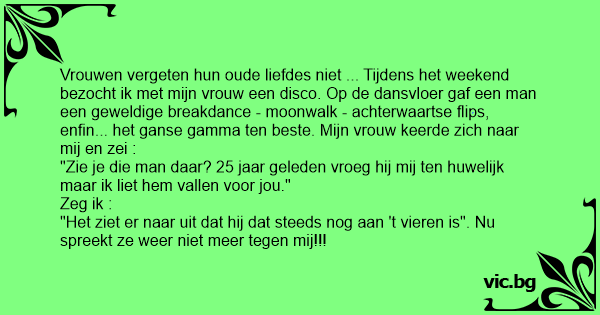 Vrouwen vergeten hun oude liefdes niet ... Tijdens het weekend bezocht ik met mijn vrouw een disco. Op de dansvloer gaf een man een geweldige breakdance - moonwalk - achterwaartse flips, enfin... het ganse gamma ten beste. Mijn vrouw keerde zich naar mij en zei :