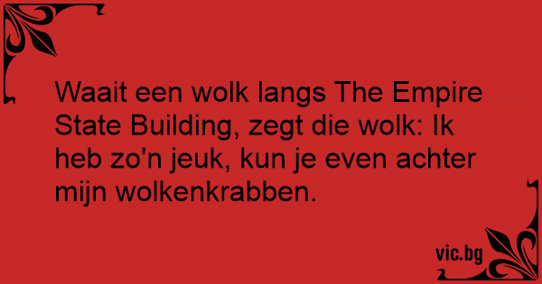 Waait een wolk langs The Empire State Building, zegt die wolk: Ik heb zo'n jeuk, kun je even achter mijn wolkenkrabben.