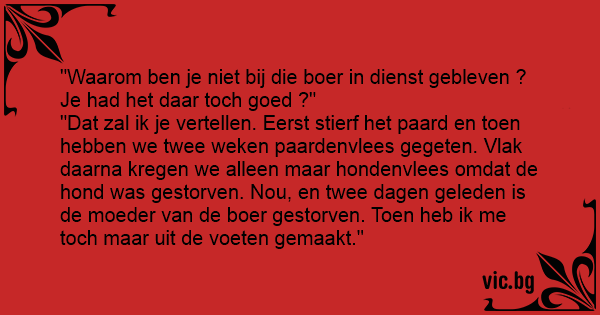"Dat zal ik je vertellen. Eerst stierf het paard en toen hebben we twee weken paardenvlees gegeten. Vlak daarna kregen we alleen maar hondenvlees omdat de hond was gestorven. Nou, en twee dagen geleden is de moeder van de boer gestorven. Toen heb ik me toch maar uit de voeten gemaakt."