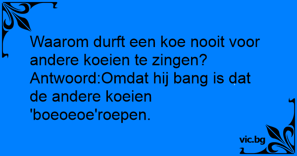 Waarom durft een koe nooit voor andere koeien te zingen?Antwoord:Omdat hij ваng is dat de andere koeien 'boeoeoe'roepen.