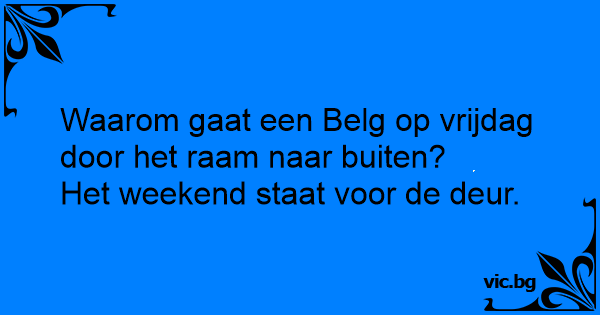 Waarom gaat een Belg op vrijdag door het raam naar buiten?Het weekend staat voor de deur. 0 0 0 Belgen moppen