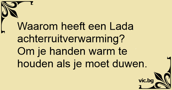 – Vet du hvorfor Ladaen har varme i bakrutene? – Nei. – Slik at det ikke skal bli så kaldt å skubbe om vinteren.