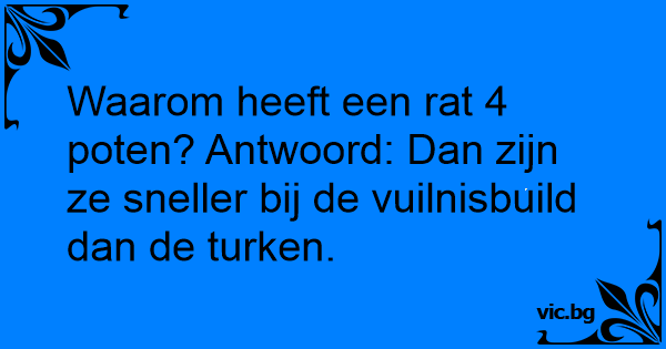 Waarom heeft een rat 4 poten? Antwoord: Dan zijn ze sneller bij de vuilnisbuild dan de turken.