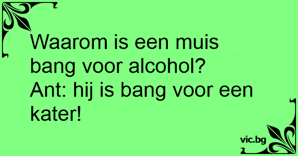Waarom is een muis ваng voor alcohol?<br />Ant: hij is ваng voor een kater!