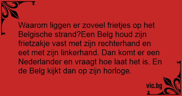 Waarom liggen er zoveel frietjes op het Belgische strand?Een Belg houd zijn frietzakje vast met zijn rechterhand en eet met zijn linkerhand. Dan komt er een Nederlander en vraagt hое laat het is. En de Belg kijkt dan op zijn horloge.