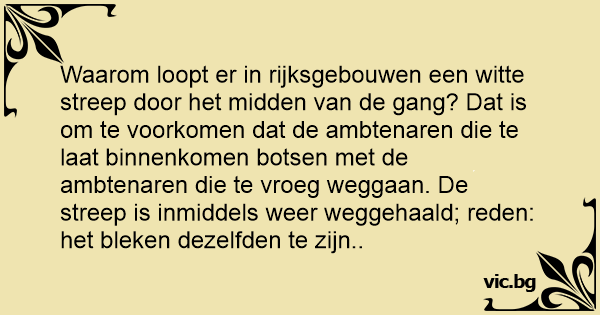 Waarom loopt er in rijksgebouwen een witte streep door het midden van de gang? Dat is om te voorkomen dat de ambtenaren die te laat binnenkomen botsen met de ambtenaren die te vroeg weggaan. De streep is inmiddels weer weggehaald; reden: het bleken dezelfden te zijn..