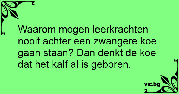 Waarom mogen leerkrachten nooit achter een zwangere koe gaan staan? Dan denkt de koe dat het kalf al is geboren.