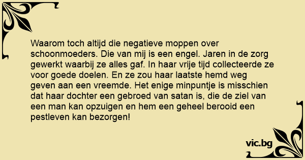 Waarom toch altijd die negatieve moppen over schoonmoeders. Die van mij is een engel. Jaren in de zorg gewerkt waarbij ze alles gaf. In haar vrije tijd collecteerde ze voor goede doelen. En ze zou haar laatste hemd weg geven aan een vreemde. Het enige minpuntje is misschien dat haar dochter een gebroed van sатаn is, die de ziel van een man kan opzuigen en hem een geheel berooid een pestleven kan bezorgen!