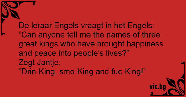 Tijdens de engelse les vraagt de juffrouw, uiteraard in het engels, aan Jantje: "Jantje, can you tell me the name of three great kings who have brought happiness and peace into people's lives?"...