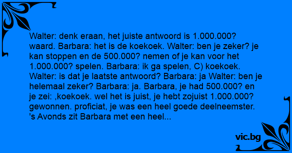 Walter: denk eraan, het juiste antwoord is 1.000.000? waard. Barbara: het is de koekoek. Walter: ben je zeker? je kan stoppen en de 500.000? nemen of je kan voor het 1.000.000? spelen. Barbara: ik ga spelen, C) koekoek. Walter: is dat je laatste antwoord? Barbara: ja Walter: ben je helemaal zeker? Barbara: ja. Barbara, je had 500.000? en je zei: ,koekoek. wel het is juist, je hebt zojuist 1.000.000? gewonnen. proficiat, je was een heel goede deelneemster. 's Avonds zit Barbara met een heel goede vriendin in een café wat na te praten en de overwinning te vieren met champagne. haar vriendin Carol vraagt: hое wist je dat een koekoek geen eigen nest bouwt? Barbara: het is toch heel simpel, hé. iedereen weet toch dat koekoeken in klokken leven.