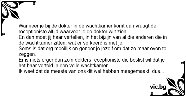 Wanneer je bij de dokter in de wachtkamer komt dan vraagt de receptioniste altijd waarvoor je de dokter wilt zien.