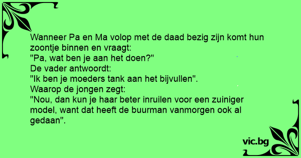 "Nou, dan kun je haar beter inruilen voor een zuiniger model, want dat heeft de buurman vanmorgen ook al gedaan".
