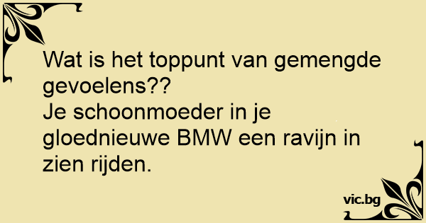 Je schoonmoeder in je gloednieuwe BMW een ravijn in zien rijden.