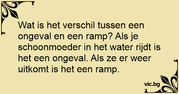 Wat is het verschil tussen een ongeval en een ramp? Als je schoonmoeder in het water rijdt is het een ongeval. Als ze er weer uitkomt is het een ramp.