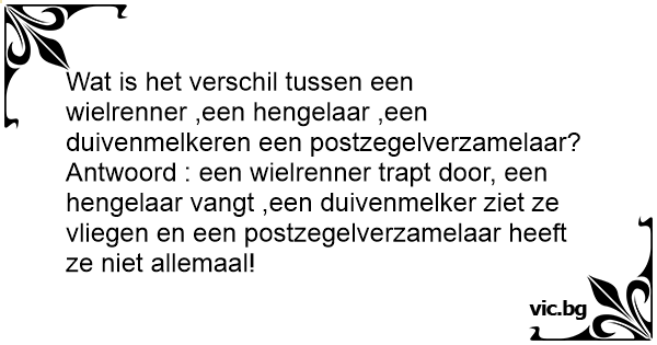 Antwoord : een wielrenner trapt door, een hengelaar vangt ,een duivenmelker ziet ze vliegen en een postzegelverzamelaar heeft ze niet allemaal!