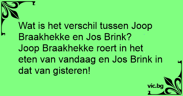 Wat is het verschil tussen Joop Braakhekke en Jos Brink? Joop Braakhekke roert in het eten van vandaag en Jos Brink in dat van gisteren!