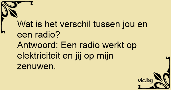 Antwoord: Een radio werkt op elektriciteit en jij op mijn zenuwen.