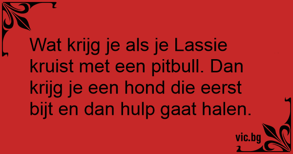 Wat krijg je als je Lassie kruist met een pitbull. Dan krijg je een hond die eerst bijt en dan hulp gaat halen.