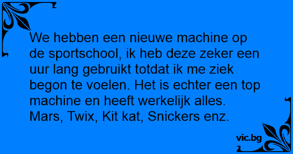Във фитнеса има нова машина. Ползвах я около час и вече ми е много зле. Иначе има всичко, марсове, сникърси, меденки, кола ...