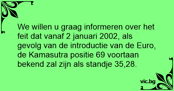 We willen u graag informeren over het feit dat vanaf 2 januari 2002, als gevolg van de introductie van de Euro, de Kamasutra positie 69 voortaan bekend zal zijn als standje 35,28.