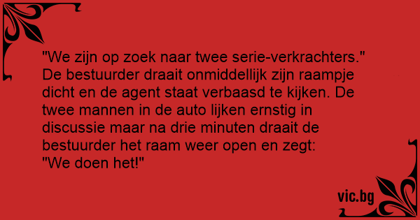 De bestuurder draait onmiddellijk zijn raampje dicht en de agent staat verbaasd te kijken. De twee mannen in de auto lijken ernstig in discussie maar na drie minuten draait de bestuurder het raam weer open en zegt: