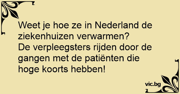 Weet je hое ze in Nederland de ziekenhuizen verwarmen?<br />De verpleegsters rijden door de gangen met de patiënten die hoge koorts hebben!