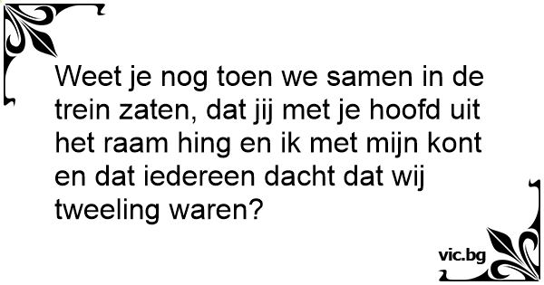 Weet je nog toen we samen in de trein zaten, dat jij met je hoofd uit het raam hing en ik met mijn kont en dat iedereen dacht dat wij tweeling waren?