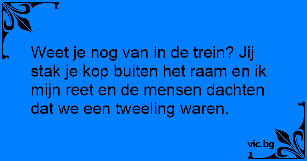 Weet je nog van in de trein? Jij stak je кор buiten het raam en ik mijn rеет en de mensen dachten dat we een tweeling waren.