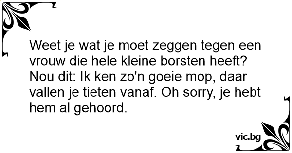 Weet je wat je moet zeggen tegen een vrouw die hele kleine borsten heeft?<br />Nou dit: Ik ken zo'n goeie mop, daar vallen je tieten vanaf. Oh sorry, je hebt hem al gehoord.