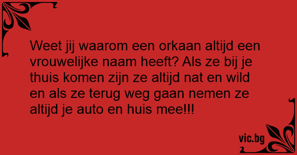 Weet jij waarom een orkaan altijd een vrouwelijke naam heeft? Als ze bij je thuis komen zijn ze altijd nat en wild en als ze terug weg gaan nemen ze altijd je auto en huis mee!!!