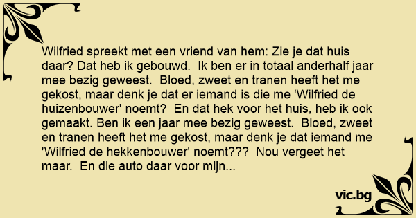Седат дедо и внук на некој рид и гледаат кон селото доле. Дедото му вели на внукот: - Ги гледаш оние големите куќи во селото? Јас ги имам градено со овие две раце! Дали ме викаат Цветко...