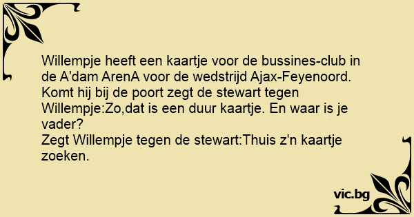 Komt hij bij de poort zegt de stewart tegen Willempje:Zo,dat is een duur kaartje. En waar is je vader?