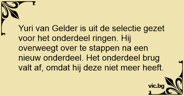 Yuri van Gelder is uit de selectie gezet voor het onderdeel ringen. Hij overweegt over te stappen na een nieuw onderdeel. Het onderdeel brug valt af, omdat hij deze niet meer heeft.