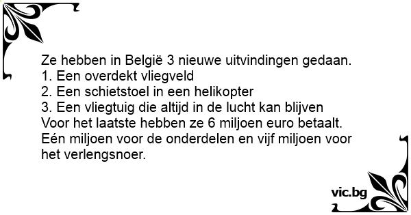 Ze hebben in België 3 nieuwe uitvindingen gedaan. 1. Een overdekt vliegveld 2. Een schietstoel in een helikopter 3. Een vliegtuig die altijd in de lucht kan blijven Voor het laatste hebben ze 6 miljoen euro betaalt. Eén miljoen voor de onderdelen en vijf miljoen voor het verlengsnoer.