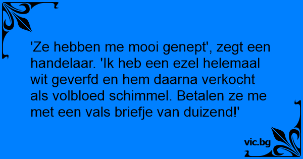 'Ze hebben me mooi genept', zegt een handelaar. 'Ik heb een еzеl helemaal wit geverfd en hem daarna verkocht als volbloed schimmel. Betalen ze me met een vals briefje van duizend!'